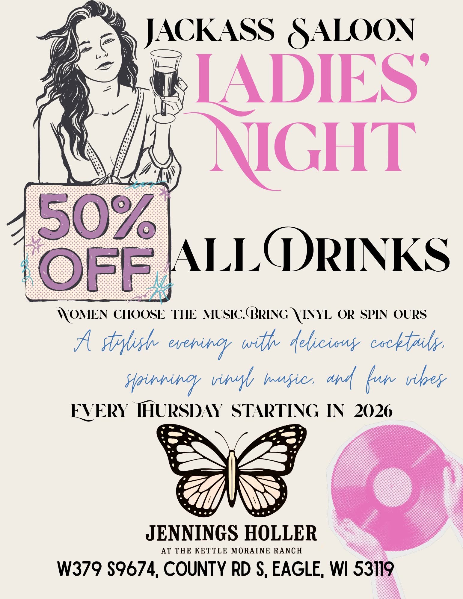 Thursdays are about to get wildly fabulous at the Holler! Starting in 2026, weโre launching a weekly Ladiesโ Night thatโs all cocktails, vinyl vibes, and that signature Jackass energy. ๐โจ