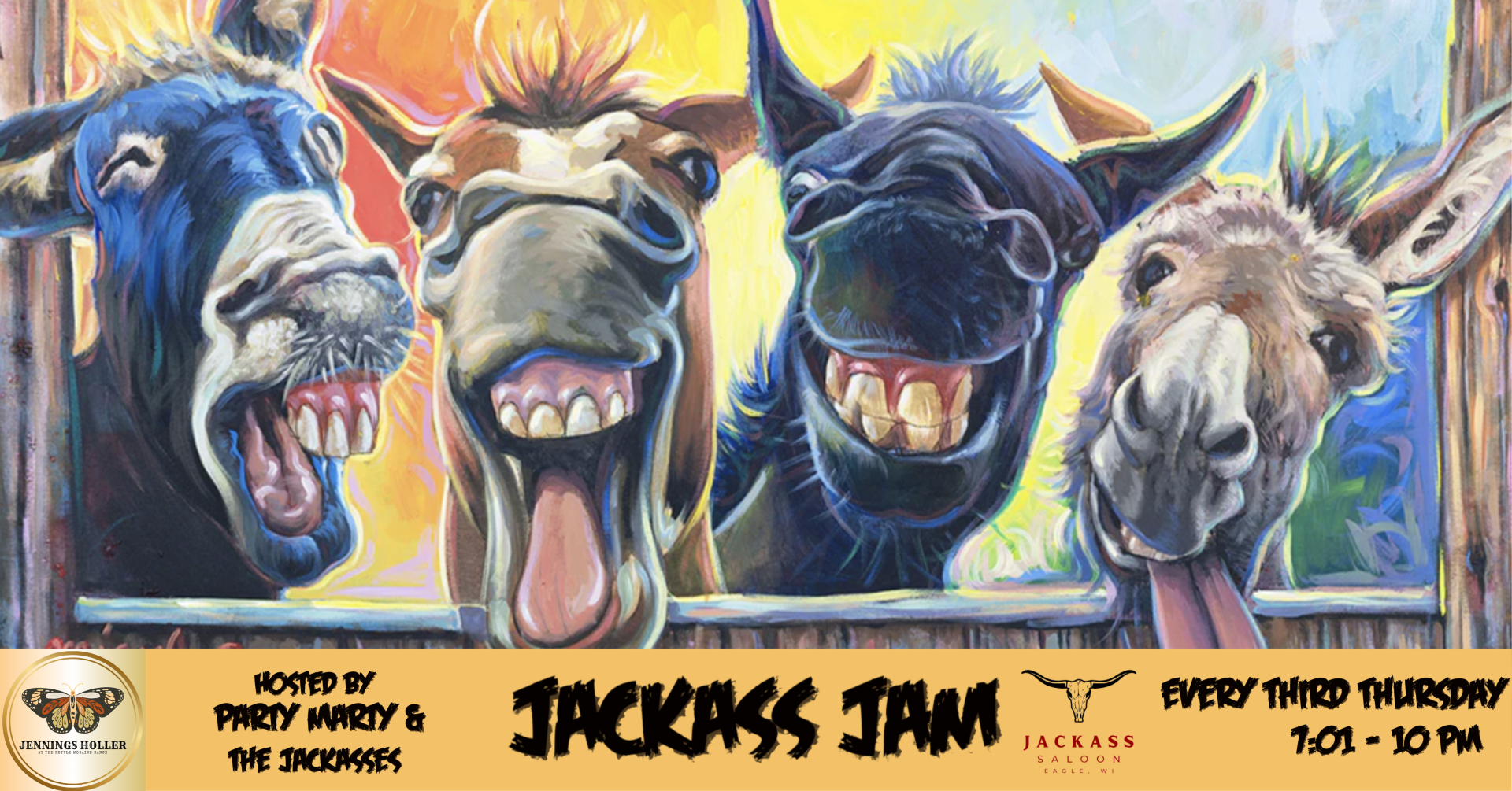 Hosted by Party Marty and the Jackasses (rotating musicians including members of Wise Jennings, dirtbags and more).